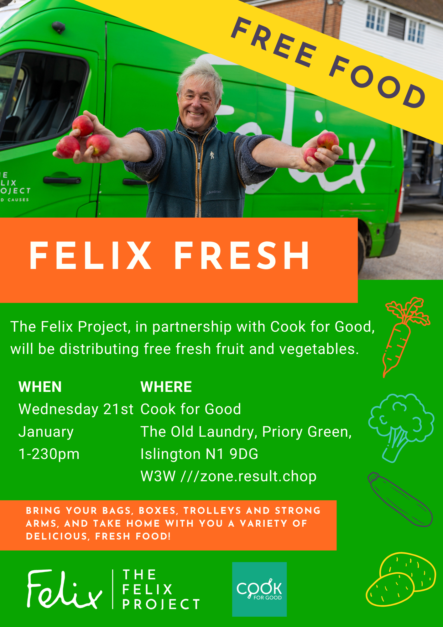 The Felix Fresh van will be at Cook for Good on Wednesday 21 January, 1.00–2.30pm, offering a wide variety of free fresh fruit and vegetables. No referral is needed and everyone is welcome.