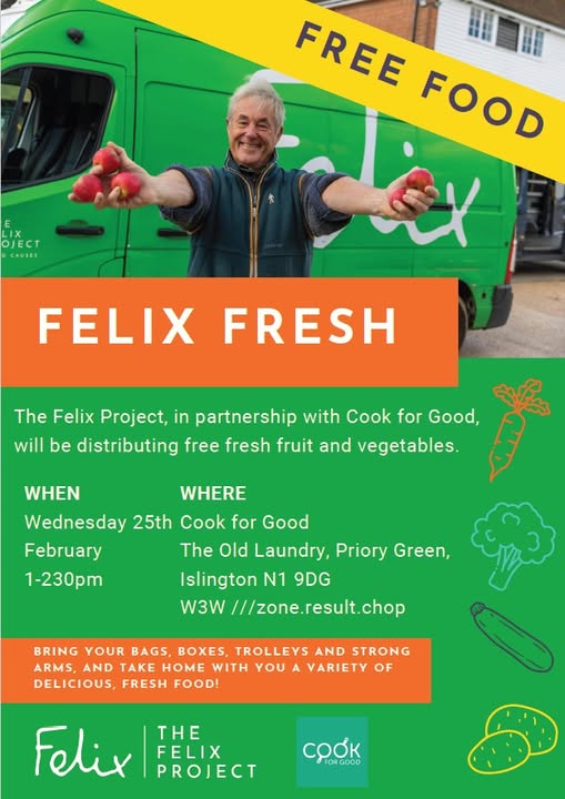 Islington Food Partnership is promoting this free fresh food distribution, delivered by IFP members The Felix Project and Cook for Good, supporting local residents to access good-quality surplus food.