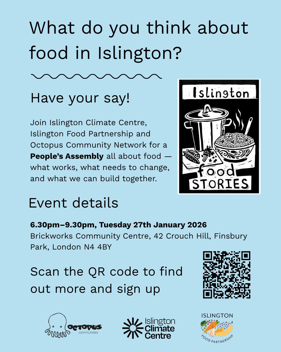Join Islington Climate Centre, Islington Food Partnership and Octopus Community Network for a People’s Assembly all about food — what works, what needs to change, and what we can build together.